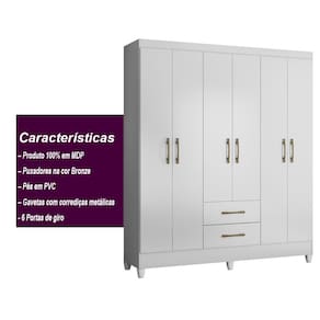 - Produto em MDP - Corrediça metálica - Portas e frente de gaveta de 15 mm - Bastão em madeira reflorestado revestido - Pés em PVC - Puxadores na cor bronze - Possui Espelho: Não - Impressão UV - Quantidade de Portas: 06 - Quantidade de Prateleiras: 05 - Quantidade de Gavetas: 02 - Quantidade de Cabideiros: 02 - Quantidade de Calceiros: 02 - Acompanha manual de montagem: Sim - Tipo de Porta: Bater - Tipo de Gaveta: Externa