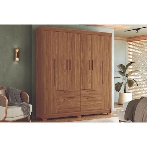 Material do Calceiro - Calceiro Metálico Material dos Cabideiros - Cabideira Metálico Tipo de Porta do Guarda-Roupa - Portas de Bater Quantidade de Portas - 6 Portas de Abrir Tipo de Espelho - Sem Espelho Tipo de Corrediça - c/ Corrediças Telescópicas Quantidade de Gavetas - 4 Gavetas Material de Estrutura Fundo Gaveta - Em HDF Quantidade de Pés - 6 pés