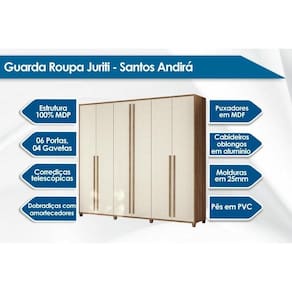 Material do Calceiro - Calceiro Metálico Tipo de Cabideiro - Aéreo Material dos Cabideiros - Cabideira Metálico Tipo de Porta do Guarda-Roupa - Portas de Bater Material das Portas - Portas em MDP Tipo de Dobradiças - Dobradiça Slowmotion Material das Gavetas - Gavetas em MDP Quantidade de Gavetas - 4 Gavetas Tipo dos Pés - ABS/PVC Quantidade de Pés - 8 pés Material das Prateleiras - Prateleiras em MDP Quantidade de Prateleiras - 7 Quantidade de Nichos - 2 Nichos