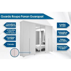 Guarda Roupa Casal 6 Portas e 6 Gavetas c/ Espelho e Pés Guarapari Branco - Panan