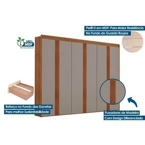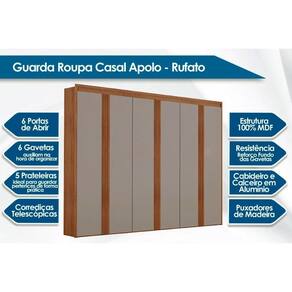 Material do Calceiro - Calceiro Metálico Tipo de Cabideiro - Aéreo Material dos Cabideiros - Cabideira Metálico Tipo de Porta do Guarda-Roupa - Portas de Bater Material das Portas - Portas em MDF Tipo de Dobradiças - Dobradiças Metálicas Quantidade de Portas - 6 Portas de Abrir Material das Gavetas - Gavetas em MDF Quantidade de Gavetas - 6 Gavetas Tipo dos Pés - ABS/PVC Quantidade de Pés - 8 pés Material das Prateleiras - Prateleiras em MDF Quantidade de Prateleiras - 5 Quantidade de Nichos - 2 Nichos