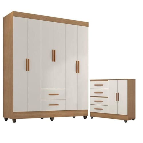 Guarda Roupa Casal 6 Portas e Cômoda 4 Gavetas 2 Portas Lite Nature Off White Móveis Leão