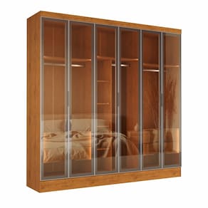 Além da funcionalidade, o roupeiro também se destaca pela sua estrutura robusta e bem planejada, oferecendo estabilidade e resistência para o uso diário. Seu acabamento em tom amadeirado traz aconchego ao ambiente e combina facilmente com diferentes estilos de decoração, desde os mais modernos até os mais clássicos.