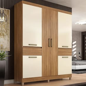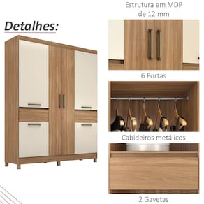Guarda Roupa Casal 6 PT 2 GV 62760, é um produto espaçoso, com design moderno e sofisticado. Estrutura em MDP de 12 mm, que conta com pintura em acabamento UV. Composto por 6 portas com dobradiças metálicas, puxadores em plástico ABS e design de diferentes dimensões que criam um ponto de destaque no ambiente, 2 gavetas externas com corrediças metálicas, as portas centrais dão acesso a 3 prateleiras que suportam até 5 Kg cada, ideais para armazenar pertences que precisam ficar sempre à mão, nas portas laterais superiores cabideiro metálico para roupas de até médio comprimento, e nas portas laterais inferiores excelente espaço para organizar os sapato, e para proteger da umidade seus pés são de PVC. Além de ampla capacidade de armazenamento, foi desenvolvido para oferecer total conforto e comodidade para você. Este móvel chegará na sua casa separado em 02 volumes.