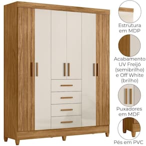 Projetado para atender às necessidades do dia a dia, o Guarda-Roupa Casal Aruba oferece espaço e modernidade. Estrutura em MDP (15/ 12 mm) e acabamento em pintura UV. Composto por portas com dobradiças metálicas (portas laterais em MDF com detalhe frisado), cabideiro interno (alumínio), gavetas com corrediças metálicas e prateleiras. Produto com dupla opção de montagem: pés em PVC ou sapatas plásticas (2 mm) conforme preferência do cliente. Este produto será entregue em 03 volumes.