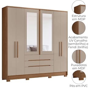 Projetado para atender às necessidades do dia a dia, o Guarda-Roupa Casal San Francisco oferece espaço e modernidade. Estrutura em MDP (15/ 12 mm) e acabamento em pintura UV. Composto por portas com dobradiças metálicas, cabideiro interno (alumínio), gavetas com corrediças metálicas e prateleiras. Produto com dupla opção de montagem: pés em PVC ou sapatas plásticas (2 mm) conforme preferência do cliente. Este produto será entregue em 05 volumes.