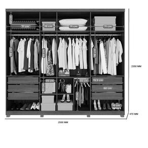 Características: Estrutura em MDP 7 Portas 6 Gavetas 10 prateleiras Corrediças telescópicas Cabideiro em alumínio Pés inclusos