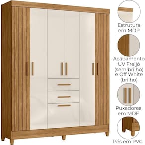 Desenvolvido para facilitar sua rotina, o Guarda-Roupa Casal Malta traz design funcional e amplo espaço interno. Estrutura em MDP (15/ 12 mm) e acabamento em pintura UV. Composto por portas com dobradiças metálicas (laterais em MDF com detalhes frisados), prateleiras internas, cabideiro interno (alumínio) e gavetas com corrediças metálicas. Produto com dupla opção de montagem: pés em PVC ou sapatas plásticas (2 mm) conforme preferência do cliente. Este produto será entregue em 03 volumes.