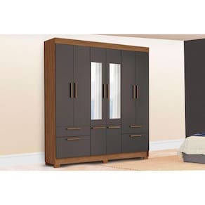 Material dos Cabideiros - Cabideira Metálico Tipo de Porta do Guarda-Roupa - Portas de Bater Quantidade de Portas - 8 Portas de Abrir Quantidade de Portas com Espelho - 2 Portas com Espelho Tipo de Espelho - Espelho Externo Quantidade de Espelhos - 2 Espelhos Tipo de Corrediça - c/ Corrediças Telescópicas Quantidade de Gavetas - 4 Gavetas Material de Estrutura Fundo Gaveta - Em HDF Tipo dos Pés - ABS/PVC Quantidade de Pés - 6 pés