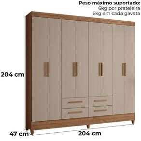 Desenvolvido para facilitar sua rotina, o Guarda-Roupa Casal Flórida traz design funcional e amplo espaço interno. Estrutura em MDP (15/12 mm) e acabamento em pintura UV. Composto por portas com dobradiças metálicas, prateleiras internas, cabideiro interno (alumínio) e gavetas com corrediças telescópicas. Produto com dupla opção de montagem: pés em PVC ou sapatas plásticas (2 mm) conforme a preferência do cliente. Este produto será entregue em 04 volumes.