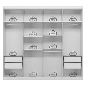 Guarda Roupa Casal 8 portas 4 gavetas Master New Branco: O Master New 8.4 oferece divisão interna pensada para casal: espaço certo para ele e para ela com gavetas que deslizam macio e prateleiras amplas. Acabamento com textura semi-brilho que dá um ar sofisticado ao ambiente.