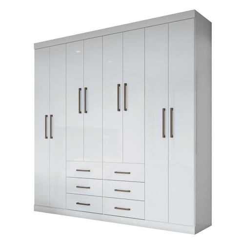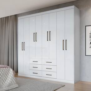 Ele é um guarda roupa 8 portas, ou seja, excelente para quem ocupa muito espaço. As portas possuem dobradiças metálicas, mas ele também conta com 6 gavetas de amplo espaço interno, 3 cabideiros e várias prateleiras formando nichos com espaço suficiente para ajudar a organizar suas roupas. Ah, e todo fabricado em MDP/MDF com acabamento em verniz fosco para maior durabilidade e resistência!