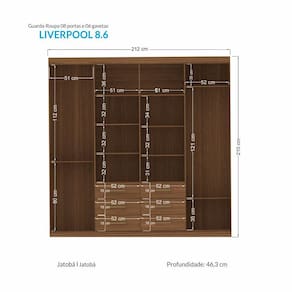Um guarda-roupa, com muito estilo e funcionalidade! Características:Ele possui puxadores em ABS Contém um ótimo local para armazenar sapatos. Ah! E possui 6 prateleiras para guardar além de roupas, cobertores, toalhas, travesseiros etc. 8 portas. Tudo é claro com muito espaço e organização. Conta também com amplas 6 gavetas internas com corrediças metálicas, que deslizam suavemente. E temos opcionais de pés em Abs e espelhos. Possui 3 cabideiros/calceiros em alumínio, para acentuar ainda mais a praticidade e organização que esse guarda-roupa oferece. Dimensões:Altura: 210 cm Largura: 212 cm Profundidade: 46,3 cm Peso: 133 Kg Observação:Produto para uso residencial em ambiente interno, não devendo ficar exposto diretamente ao sol, calor e umidade excessiva. Pode haver alguma diferença de tonalidade entre a imagem e o produto real, por conta do tratamento de imagens e a calibração de cores do seu monitor. As imagens são meramente ilustrativas, não acompanham objetos de decoração e eletrônicos.A empresa Móvel Decore não se responsabiliza por montagens/desmontagens ou instalação dos produtos adquiridos neste site, como também ficando sob responsabilidade do cliente/comprador eventuais despesas no ato da entrega, por subir escadas/elevadores ou pelo transporte por guincho em apartamentos. Por conta disso, sempre confira as dimensões do produto e certifique-se que as medidas sejam suficientes para entrada em elevadores, portas, escadas e/ou corredores de sua residência.Ao receber a mercadoria, o cliente deve verificar as condições da embalagem, caso haja alguma avaria não assine o comprovante de recebimento.Manutenção: Não limpar com álcool ou qualquer outro produto químico, utilize somente pano seco ou levemente umedecido.Garantia de Fábrica: 03 Meses (90 dias)