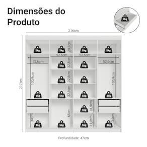 As portas fecham de forma suave e silenciosa, por possuir dobradiças com amortecimento. As gavetas permitem uma abertura completa e o amplo maleiro é perfeito para armazenar itens maiores. O interior do guarda-roupa pode ser personalizado, com a possibilidade de ajustar as gavetas e prateleiras conforme suas necessidades.