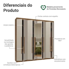 As portas fecham de forma suave e silenciosa, por possuir dobradiças com amortecimento. As gavetas permitem uma abertura completa e o amplo maleiro é perfeito para armazenar itens maiores. O interior do guarda-roupa pode ser personalizado, com a possibilidade de ajustar as gavetas e prateleiras conforme suas necessidades. Além disso, as portas do meio possuem espelho, agregando ainda mais funcionalidade.