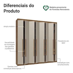 As portas fecham de forma suave e silenciosa, por possuir dobradiças com amortecimento. As gavetas permitem uma abertura completa e o amplo maleiro é perfeito para armazenar itens maiores. O interior do guarda-roupa pode ser personalizado, com a possibilidade de ajustar as gavetas e prateleiras conforme suas necessidades.
