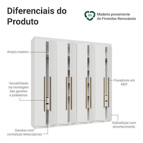 Possui uma pintura de alta resistência, que garante durabilidade e um acabamento impecável por muito mais tempo. A estrutura e as portas são na cor branca e os puxadores em tom amadeirado Rustic, criando um visual sofisticado que se adapta a qualquer estilo de decoração. Os puxadores de 80 cm, fabricados em MDF, são um dos grandes diferenciais, trazendo um design alongado e moderno.