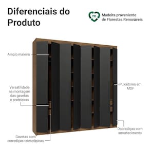Possui uma pintura de alta resistência, que garante durabilidade e um acabamento impecável por muito mais tempo. A estrutura é na cor Crema e as portas e puxadores são na cor Preta, criando um visual sofisticado que se adapta a qualquer estilo de decoração. Os puxadores de 80 cm, fabricados em MDF, são um dos grandes diferenciais, trazendo um design alongado e moderno.