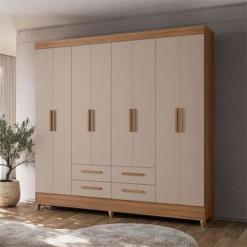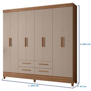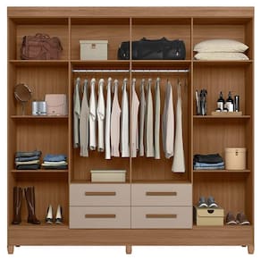 Espaco de qualidade Sao 8 portas de bater, 4 gavetas com corredicas metalicas, prateleiras, 2 cabideiros em aluminio, e maleiro a disposicao para voce colocar objetos, artigos de beleza, roupas dobradas nas prateleiras ou esticadas nos cabides para nao amassar, enfim, opcoes de espaco nao vao faltar!