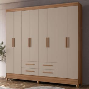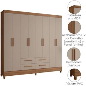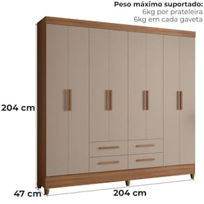 Desenvolvido para facilitar sua rotina, o Guarda-Roupa Casal Flórida traz design funcional e amplo espaço interno. Estrutura em MDP (15/12 mm) e acabamento em pintura UV. Composto por portas com dobradiças metálicas, prateleiras internas, cabideiro interno (alumínio) e gavetas com corrediças telescópicas. Produto com dupla opção de montagem: pés em PVC ou sapatas plásticas (2 mm) conforme a preferência do cliente. Este produto será entregue em 04 volumes.