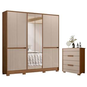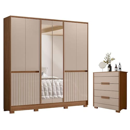 Começou a montar seu quarto? Então apresentamos para você este belo conjunto composto pelo guarda roupa da linha Alasca e a cômoda da linha Dhara. O guarda roupa conta com dez portas, sendo as duas centrais com espelho. As quatro portas inferiores com detalhes frisados em MDF agregam um charme. Com suas quatro gavetas internas, ganha, mas espaço para acomodar suas roupas. Completando o conjunto, assim como o guarda roupa, a cômoda conta com quatro gavetas equipadas com corrediças telescópicas, puxadores em MDF e pés em PVC, oferecendo mais estabilidade e durabilidade. Fabricados pela Moval, são desenvolvidos em MDP, sendo perfeito para quem busca funcionalidade, beleza e qualidade em cada detalhe. Aproveite e garanta já o seu!