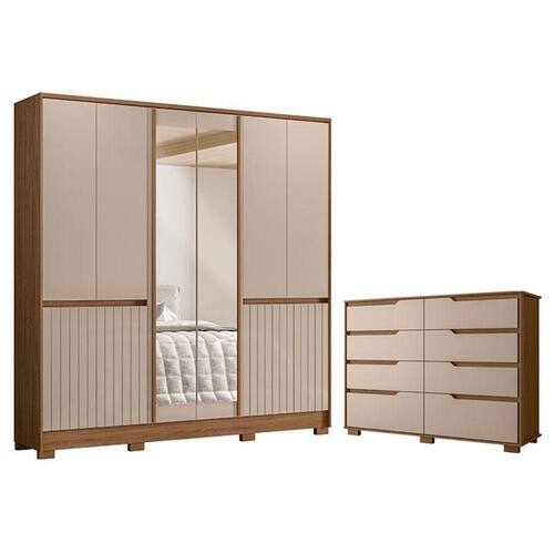 Está montando seu quarto? Apresentamos para você este belo conjunto composto pelo guarda roupa da linha Alasca e a cômoda da linha Georgia. O guarda roupa conta com design sofisticado e um amplo espaço interno com suas dez portas, sendo as duas centrais com espelho e as quatro inferiores com detalhes frisados e puxadores em MDF. Internamente oferece quatro gavetas. Complementando o conjunto, a cômoda possui oito gavetas espaçosas. Os puxadores usinados oferecem um visual clean e moderno. Assim como o guarda roupa, conta com corrediças telescópicas e pés em PVC, garantindo maior resistência e facilidade na hora da limpeza. Fabricados pela Moval, são desenvolvidos em 100% MDP de qualidade, sendo perfeito para quem deseja compor seu quarto com elegância e praticidade. Aproveite e garanta já o seu!