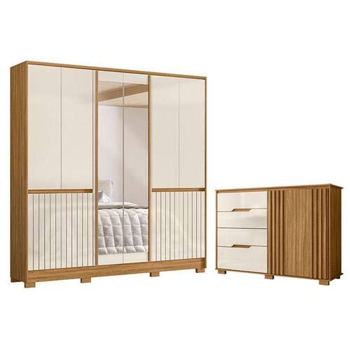Começou a montar seu quarto? Então apresentamos para você este belo conjunto composto pelo guarda roupa da linha Alasca e a cômoda da linha Texas. O guarda roupa oferece um amplo espaço interno com suas dez portas, sendo as duas centrais com espelho e as quatro portas inferiores com detalhes frisados. Os puxadores em MDF entregam um toque de elegância. Internamente conta com quatro gavetas. Complementando o conjunto, a cômoda apresenta um design moderno com detalhes frisados nas duas portas e possui quatro gavetas. Assim como o guarda roupa, conta com corrediças telescópicas e pés em PVC, garantindo mais estabilidade e praticidade. Fabricados pela Moval, são desenvolvidos em 100% MDP de qualidade, oferecendo mais durabilidade, ótimo aproveitamento de espaço e um design que combina com qualquer ambiente de quarto. Aproveite e garanta já o seu!