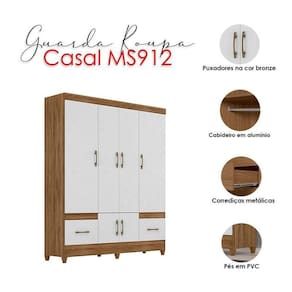 Começou a montar seu quarto? Então apresentamos para você este belo guarda roupa da linha MS912. Possuindo seis portas, revela um amplo espaço interno para acomodar suas roupas e acessórios. Além disso, conta com duas gavetas equipadas com corrediças metálicas, proporcionando um deslizamento mais suave. Os puxadores na cor bronze dão um toque de requinte, enquanto os pés em PVC garantem mais estabilidade e durabilidade. Fabricado pela Moval, é desenvolvido em 100% MDP de alta qualidade. Com um design moderno e acabamentos refinados é perfeito para quem está procurando otimizar o espaço sem abrir a mão da organização, aproveite!
