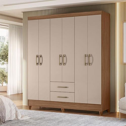 Começou a montar seu quarto? Então apresentamos para você este belo guarda roupa da linha Panamá. Conta com seis portas proporcionando um amplo espaço interno para guardar suas roupas e acessórios de forma prática. Além de possuir duas gavetas equipadas com corrediças metálicas garantindo um deslizamento mais suave e seguro. Para maior estabilidade e durabilidade conta com pés em PVC. Fabricado pela Moval, é desenvolvido em 100% MDP de alta qualidade, sendo a escolha perfeita para quem busca elegância, design moderno, praticidade e organização para o quarto do casal, aproveite!