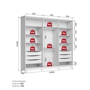 O Roupeiro Americano Prime foi deselvolvido para o público que busca elegância e qualidade. Possui 06 portas com usinados de baixo relevo, 06 gavetas com corrediças telescópicas e usinagem para pega, cabideiros e calceiros em alumínio, puxadores em alumínio, dobradiças com amortecimento, chapéu com molduras de 25 mm, ripas laterais, frentes e tampos das gavetas na cor da caixa. Seu amplo espaço interno oferece uma organização eficiente e prática para suas roupas. Cor: Branco Altura (cm): 230 Largura (cm): 256 Profundidade (cm): 52,5 Cor Interna: Trama Branco (Branco Acinzentado) Escala de Brilho: Fosco Ambiente: Quarto Acabamento: Pintura UV Texturizada Possui Vidros: Não Material Principal: MDF/MDP Produto Suporta até (Kg): 90 Kg Possui Espelho: Não Possui Gavetas: Sim - Quantidade: 6 Und. - Peso Maximo Suportado por Gaveta: 3 Kg Possui Pés: Sim Quantidade de Pés: 8 Und. - Material dos Pés: ABS Possui Portas: Sim - Quantidade: 6 Und. - Tipo: Bater Possui Prateleiras: Sim - Peso Maximo por Prateleira: 8 Kg - Quantidade: 7 Und. Recomendações de Uso, Manutenção e Limpeza: Para limpeza de seu móvel, use uma flanela limpa e seca. Não utilize produtos químicos que possam danificar o produto. Sistema de Montagem: Parafusos e Cavilhas Necessita Montagem: Sim Complexidade da Montagem: Alta: Deve ser montado por um montador especializado. Itens Inclusos: 1 Guarda Roupa e Instrução de Montagem Garantia: 90 Dias