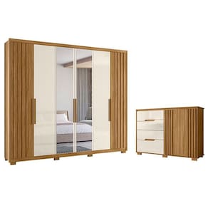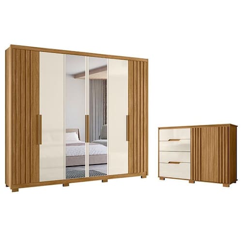 Começou a procurar móveis para montar seu quarto? Então apresentamos para você este belo conjunto composto pelo guarda roupa da linha Araguaia e a cômoda da linha Texas. O guarda roupa conta com seis portas. Seu diferencial são as três opções na hora da montagem das portas, permitindo a personalização do seu gosto. Os puxadores em MDF garantem um visual moderno. Internamente, conta com quatro gavetas. Complementando o conjunto, a cômoda traz duas portas com detalhes ripados e quatro gavetas, ganhando um espaço extra para acomodar suas roupas. Tanto o guarda roupa, quanto a cômoda, são equipados com corrediças telescópicas e pés em PVC oferecendo mais estabilidade e praticidade. Fabricados pela Moval, são desenvolvidos em MDP, ideal para quem busca design moderno, versatilidade e qualidade, aproveitem!