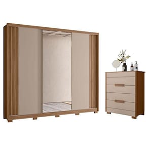 Está montando seu quarto? Apresentamos para você este belo guarda roupa da linha Arizona e a cômoda da linha Dhara. O guarda roupa conta com três portas deslizantes, sendo a porta central com espelho. Os puxadores ripados em MDF dão um toque de sofisticação. Internamente, possui seis gavetas espaçosas. Complementando o conjunto, a cômoda conta com quatro gavetas, ideais para acomodar suas roupas. Tanto o guarda roupa quanto a cômoda, é equipado com corrediças telescópicas e pés em PVC facilitando a limpeza e garantindo mais durabilidade. Fabricados pela Moval, são desenvolvidos em MDP, unindo design moderno, qualidade e praticidade para compor seu quarto com mais estilo, aproveitem!
