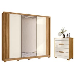 Está montando seu quarto? Apresentamos para você este belo guarda roupa da linha Arizona e a cômoda da linha Dhara. O guarda roupa conta com três portas deslizantes, sendo a porta central com espelho. Os puxadores ripados em MDF dão um toque de sofisticação. Internamente, possui seis gavetas espaçosas. Complementando o conjunto, a cômoda conta com quatro gavetas, ideais para acomodar suas roupas. Tanto o guarda roupa quanto a cômoda, é equipado com corrediças telescópicas e pés em PVC facilitando a limpeza e garantindo mais durabilidade. Fabricados pela Moval, são desenvolvidos em MDP, unindo design moderno, qualidade e praticidade para compor seu quarto com mais estilo, aproveitem!