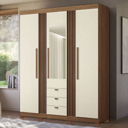 O(a) Guarda-Roupa Casal Aurora 3 Portas 3 Gavetas com Espelho Ripado Jatoba/Areia - Santos Andirá é produzido em MDP e HDF na escala de brilho Semi-Brilho, e possui um grau de dificuldade de montagem: Médio.