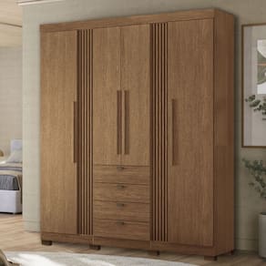 O(a) Guarda-Roupa Casal Aurora 4 Portas 4 Gavetas Ripado Jatoba - Santos Andirá é produzido em MDP e HDF na escala de brilho Semi-Brilho, e possui um grau de dificuldade de montagem: Médio.
