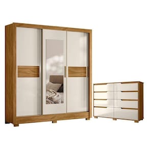 Organize seu quarto com elegância e o melhor custo benefício do mercado. Apresentamos o Guarda Roupa Casal Bahamas e Cômoda Texas fabricados pela Moval. Guarda Roupa com 03 portas deslizantes e 02 gavetas com corrediças metálicas, portas laterais com moldura de 25mm, espelhos inclusos, puxadores em MDF, cabideiros em alumínio para melhor organização interna, sistema anti-empeno metálico, espaço ideal para roupas longas e pés em PVC. A cômoda possui 04 gavetas com corrediças telescópicas, dobradiças 35mm com amortecedor, portas com detalhes ripados, puxadores usinados e pés em PVC. Fabricado com materiais de alta qualidade que garante resistência e durabilidade ao produto. Confira mais detalhes e aproveite!