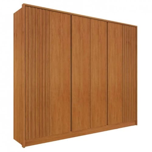 Características: Laterais Ripadas Produto em MDF e MDP Moldurado em MDF 25mm Suporte e cabideiros em alumínio Distanciadores em MDF 25mm Gavetas internas com puxadores em PVC Puxadores internos nas portas centrais Dobradiças metálicas de 35mm Gavetas com corrediças telescópicas Cabideiros em alumínio 6 Gavetas e 6 Portas