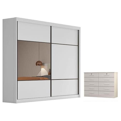 Procurando móveis para que seu quarto fique mais bonito e funcional? Aqui você encontra a opção ideal e com muita qualidade. O conjunto composto pelo guarda roupa da linha Belmonte possui várias repartições, gavetas, prateleiras, cabideiros garantindo mais organização para suas roupas e pertences. O gaveteiro da linha Milão proporciona espaço extra possui 10 gavetas equipadas com corrediças telescópicas trazendo suavidade ao abrir e fechar. Venha conferir e garantir o seu!