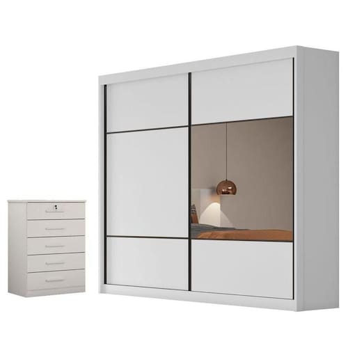 Está procurando móveis para montar seu quarto? Apresentamos para você este belo conjunto composto pelo guarda roupa da linha Belmonte e a cômoda gaveteiro da linha Suiça. O guarda roupa com design moderno apresentando 2 portas de correr e 4 gavetas equipadas com corrediças telescópicas um amplo espaço interno. A cômoda conta com 5 gavetas também com corrediças telescópicas e uma porta ganhando um espaço extra. Fabricados pela Horizonte, combinam resistência e sofisticação, sendo perfeito para organizar e otimizar o espaço no quarto do casal. Confira e aproveite!