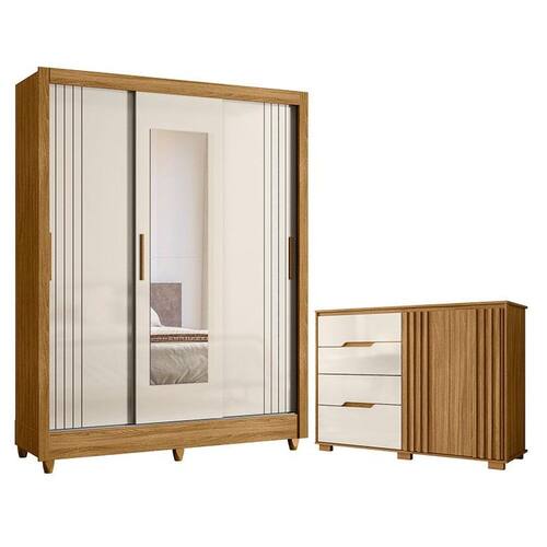 Organize seu quarto com elegância e o melhor custo benefício do mercado. Apresentamos o Guarda Roupa Casal Bolívia e Cômoda Texas fabricados pela Moval. Guarda Roupa possui três portas deslizantes, sendo a porta central com espelho, as duas portas laterais apresentam frisos em baixo relevo, com trilhos em alumínio garantindo um deslizamento suave, duas gavetas equipadas com corrediças metálicas, puxadores em MDF, cabideiro e calceiros em alumínio para melhor organização interna e pés em PVC. A cômoda possui 04 gavetas, com corrediças telescópicas, 02 portas com detalhes ripados, dobradiças 35mm com amortecedor, puxadores usinados e pés em PVC. Fabricado com materiais de alta qualidade que garante resistência e durabilidade ao produto. Confira mais detalhes e aproveite!