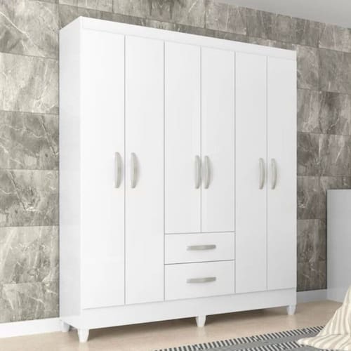 Características: Marca: Atualle Móveis Modelo: Brasília Tamanho: Casal Estrutura: MDF e MDP Quantidade de Portas: 06 Tipo de Portas: De Bater Quantidade de Gavetas: 02 Com corrediças metálicas: Sim Quantidade de Prateleiras: 05 Quantidade de Cabideiros: 02 Com Kit de Pés: Sim Quantidade de Embalagens: 01