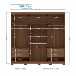 O Guarda-Roupa Buriti possui um design diferenciado e atemporal. São 6 portas, sendo 2 delas em MDF e com detalhe usinado ripado e puxadores pontuais em ABS para abertura. As demais portas em MDP seguem com puxadores em MDF revestido em formato grande. Internamente, possui 7 amplas prateleiras com muito espaço para guardar os pertences, 3 cabideiros em alumínio de excelente qualidade para pendurar as roupas, 4 gavetas com corrediças telescópicas que suportam muito mais peso, compartimento para guardar pertences de valor. Externamente, o acabamento é em textura Reverse semi fosco, suave ao toque, e que facilita a limpeza.