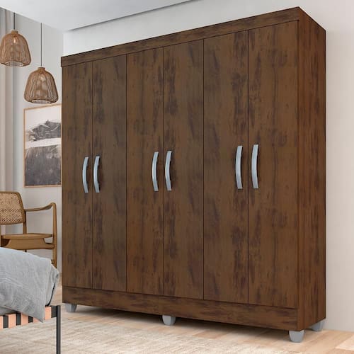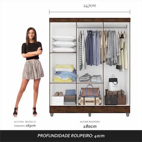 Procurando simplicidade e beleza em um guarda-roupa? O Roupeiro Cancún foi pensado para você! Fabricado com materiais de qualidade e com um design impecável é um móvel necessário que pode encantar ainda mais o seu ambiente!Medidas do Guarda-Roupa Montado: A: 180cm | L: 147cm | P: 40cm- Chapa MDP 12mm- Tonalidade: Capuccino- Dobradiça Metálica- Cabideiro de Madeira- Pés em Polietileno- Puxadores em Polietileno- Estruturado com material de altíssima qualidade, evitando fungos e mofo.Conteúdo da Embalagem:- 01 Guarda-Roupa- Plástico protetor- Caixa papelão- Acessório para MontagemObservações Importantes:- As imagens ambientadas são meramente ilustrativas e podem apresentar itens que não incorporam o produto;- Todos os nossos produtos são novos, acompanham documento fiscal e possuem garantia de 3 meses, essa garantia cobre somente defeitos de fabricação;- A entrega só será efetuada no endereço do CEP, caso o endereço seja diferente do CEP informado no pedido, a entrega terá cobrança adicional e o comprador arcará com as despesas;- Não realizamos entregas para zonas rurais, via caminhos fluviais e distritos, por isso não aceitamos CEP GERAL da região;- Não é possível realizar o agendamento de entrega do produto, é necessário que acompanhe o rastreio de seu pedido para saber a previsão de entrega;- As entregas somente serão realizadas para um responsável maior de idade (+18);- Enviamos para diversos estados, sendo assim nossas entregas são realizadas por transportadoras parceiras de nossa empresa. Confira as dimensões antes da compra e certifique-se de que o produto passará por elevadores, portas e corredores já que nossa entrega não inclui a subida de lances de escada, transporte por elevador e o lançamento de produtos, em caso de condomínios residenciais a entrega é feita somente até a portaria. Todas as entregas são realizadas em dias e horários comerciais;- Ao receber os seus produtos observe se a embalagem se encontra em perfeitas condições. Se você adquiriu algum móvel, confira atentamente a quantidade de volumes e o aspecto físico das embalagens. Confira também se a cor do móvel está de acordo com o seu pedido;- O prazo de cancelamento por arrependimento é de até 7 dias corridos a contar da data de recebimento;- Os produtos e assistências são enviados DESMONTADOS, MONTAGENS E DESMONTAGENS recomendamos sempre a contratação de um montador profissional e é válido lembrar que o custo desses serviços é por conta do comprador;- Objetos decorativos que aparecem na foto não acompanham o produto;- Evitar a exposição direta à luz solar e à umidade;- Para limpeza, limpar com pano macio e seco, não utilizar qualquer outro tipo de produtos químicos;- As cores do produto podem variar de acordo com o monitor, a iluminação do ambiente ou sua percepção visual;