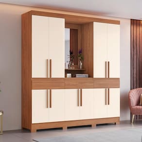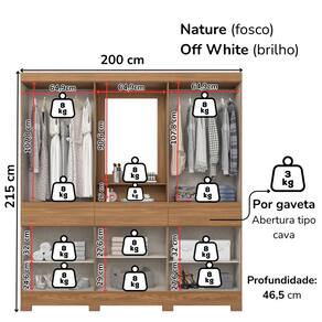 Guarda-roupa Casal B374, a solução definitiva para organizar roupas e acessórios com divisórias inteligentes e amplo espaço interno. Produzido em MDP/MDF de 12/15 mm (fundo 3 mm) com pintura UV texturizada. Conta Capelinha central com espelho e prateleira inferior, portas com dobradiças metálicas, gavetas com corrediças metálicas, puxadores em abertura tipo cava e cabideiro de madeira. As prateleiras suportam até 8 kg cada e o móvel acompanha 8 pés em ABS com 5 cm de altura. Medidas do espelho com moldura (73 x 52,4 x 0,3). Produto será entregue em 03 volumes.