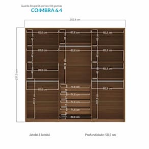 ESPECIFICAÇÕES: Estrutura em MDP Pintura UV 6 Portas Dobradiças metálicas com sistema de amortecimento Puxadores em madeira revestidos nas portas 4 Gavetas Corrediças telescópicas Puxadores em ABS Cabideiros em alumínio oblongo Prateleiras Maleiro Amplo espaço interno