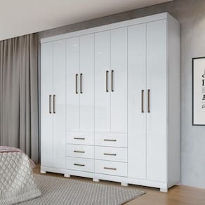 Ah, não há nada melhor do que decorar a casa do nosso jeitinho. Não é mesmo? Só que o melhor disso, é se além da decoração ser agradável, a funcionalidade dos itens escolhidos seja igualmente boa. Para isso, a Santos Andirá desenvolveu o Guarda Roupa Liverpool Branco, confira!Ele é um guarda roupa 8 portas, ou seja, excelente para quem ocupa muito espaço. As portas possuem dobradiças metálicas, mas ele também conta com 6 gavetas de amplo espaço interno, 3 cabideiros e várias prateleiras formando nichos com espaço suficiente para ajudar a organizar suas roupas. Ah, e todo fabricado em MDP/MDF, pés em madeira e com acabamento em verniz fosco para maior durabilidade e resistência!Resumindo: um item imperdível para quem gosta de organização e estilo!!Não perca tempo, adicione agora mesmo esse guarda roupa casal ao seu carrinho de compras!!Dimensões do ProdutoLargura: 212 cm.Altura: 210 cm.Profundidade: 46,3 cm.Peso: 130,50 Kg.Características do ProdutoMaterial da Estrutura: MDP.Peso Suportado: Gaveta: 3 Kg / Base: 5 Kg / Prateleiras Menores: 3 Kg / Prateleiras Maiores: 5 Kg / Prateleira Dupla: 8 Kg.Acabamento: Verniz UVEscala de Brilho: Brilhante.Quantidade de Portas: 8 Portas.Possui Espelho: Não.Quantidade de Gavetas: 6 Gavetas.Tipo de Corrediças: Metálicas.Tipo de Puxador: ABS.Possui Cabideiro: Sim.Quantidade de Cabideiros: 3 Cabideiros.Possui Prateleiras: Sim.Quantidade de Prateleiras: 9 Prateleiras.Possui Pés: Sim.Diferenciais:- Design Moderno.- Puxador na cor metálica.- Amplo maleiro.Sistema de Montagem: Cavilhas / Parafusos / Girofix.Manual de Montagem: Sim.Complexidade da Montagem: Alta.Volumes: 4 Volumes.Garantia do Fabricante: 90 dias contra defeito de fabricação.Montagem: Recomendamos que seja feita por um profissional.Recomendação de Limpeza: Utilize pano levemente úmido.Observações importantes:- Produto para uso residencial em ambiente interno, não devendo ficar exposto diretamente ao sol, calor e umidades excessivas.- Pode haver alguma diferença de tonalidade entre a imagem e o produto real, por conta do tratamento de imagens e a calibração de cores do seu monitor.- As imagens são meramente ilustrativas, não acompanham objetos de decoração e eletrônicos.- Confira o estado da embalagem, não devendo assinar o comprovante em caso de danos.- Não asseguramos, no ato da entrega, por subir escadas/elevadores, pelo transporte por guincho em apartamentos ou montagem, desmontagem e instalações. Eventuais despesas são por conta do comprador.- Confira as dimensões do produto e certifique-se de que passará normalmente por supostos elevadores, portas, escadas e/ou corredores de sua residência.