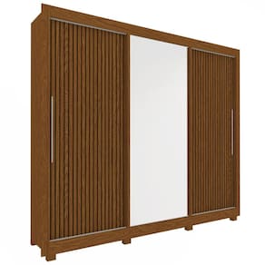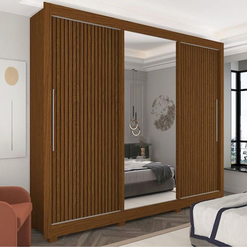 O Roupeiro Royale tem um design elegante e moderno, perfeito para seu quarto. Com interior espaçoso, este roupeiro conta com quatro gavetas de corrediças telescópicas, prateleiras e três tubos cabideiros para uma boa organização. Possui três portas de correr sendo as duas laterais de ripas autênticas em 100 MDF e a central com espelho inteiriço, unindo funcionalidade e beleza.