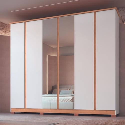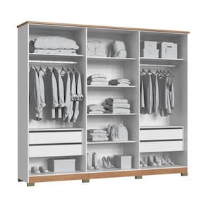 Características: Estrutura 100 em MDF 4 Gavetas Corrediças telescópicas de extração total Cabideiros de alumínio 6 Portas com acabamento em ângulo de 45º Portas com dobradiças de amortecedor Interno ele e ela Prateleiras Contém espelho Contém pés Produto flex com duas opções de tonalidade no espaçador da porta