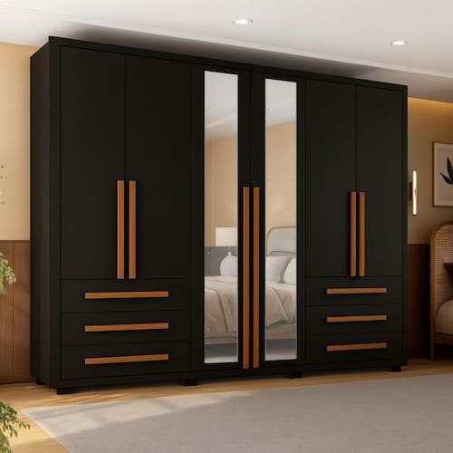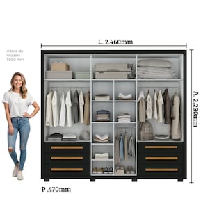 Caracter?sticas: 6 Portas Amplo espa?o interno Cabideiro e calceiro em alum?nio 6 Gavetas com corredi?as telesc?picas -abertura total e suave- P?s que facilitam a limpeza Material em MDP Espelho