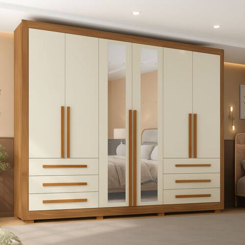 Guarda Roupa Casal com Espelho 6 Portas 6 Gavetas e Pes Veneto Maxel Moveis O Guarda-Roupa Veneto com espelho e perfeito para quem busca aliar praticidade, organizacao e estilo no quarto. Com design moderno e estrutura robusta em MDP, ele oferece amplo espaco interno para armazenar roupas e acessorios com eficiencia. Seu interior e inteligentemente distribuido, contando com cabideiro e calceiro em aluminio, que garantem maior durabilidade e suportam ate pecas mais pesadas. Alem disso, possui 6 gavetas com corredicas telescopicas, que proporcionam abertura total, suave e silenciosa, facilitando o uso no dia a dia. O movel conta ainda com 6 portas e pes que elevam sua estrutura, o que alem de facilitar a limpeza, traz um toque sofisticado ao ambiente.